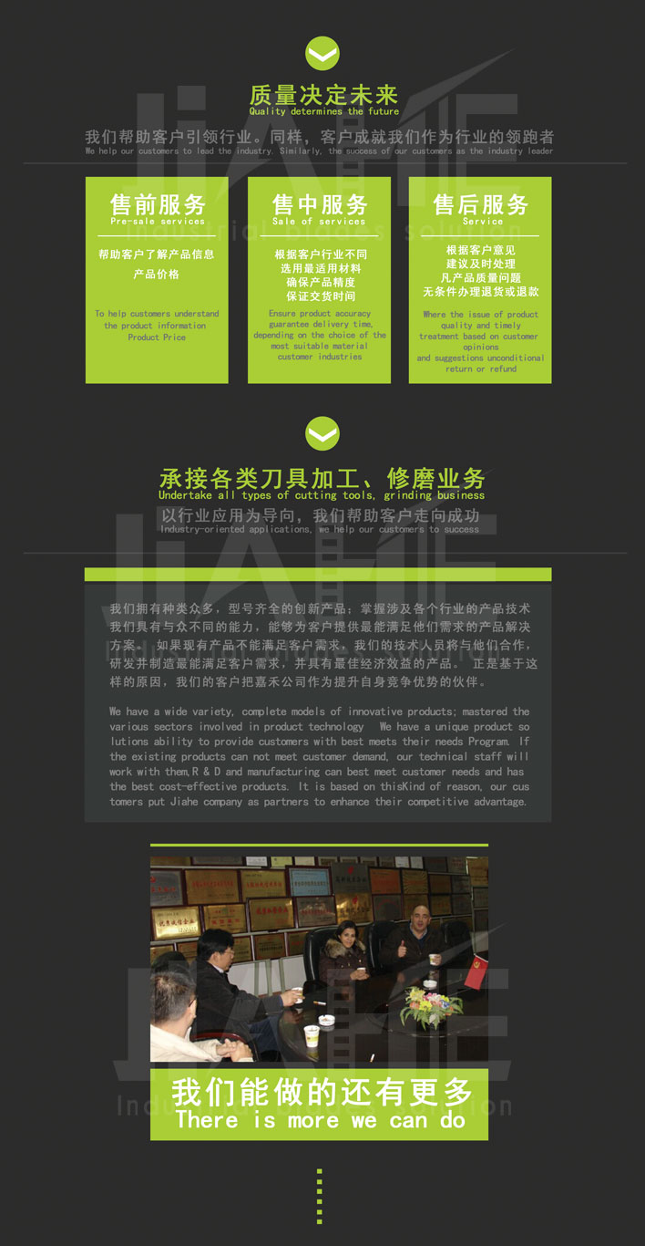 憑借優(yōu)良的設備,精湛的工藝,嚴格的檢驗,完善的售后服務,力求產品質量精益求精。致力于打造精密刀具一流品牌!